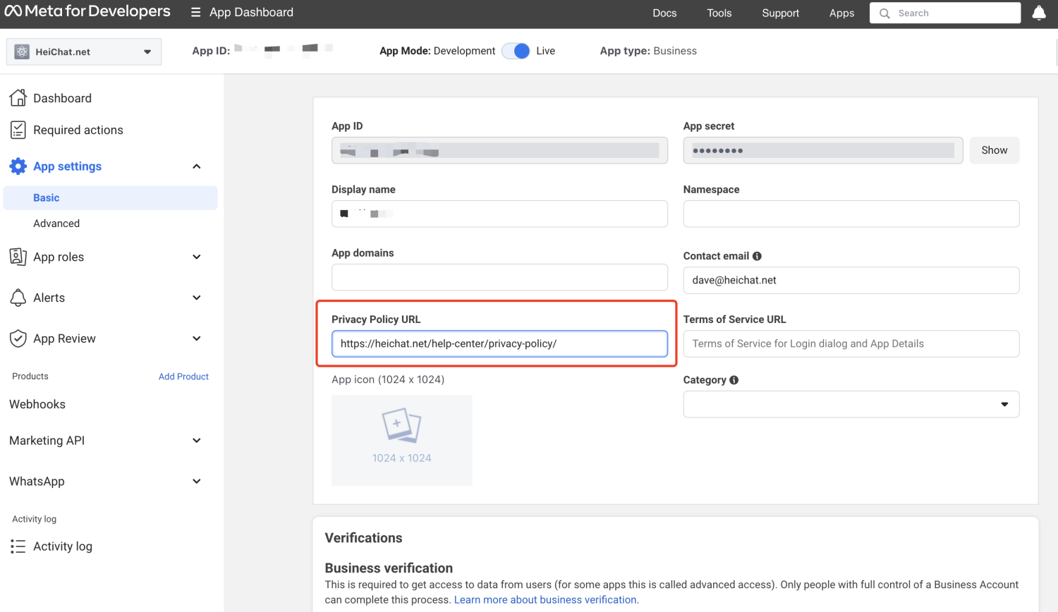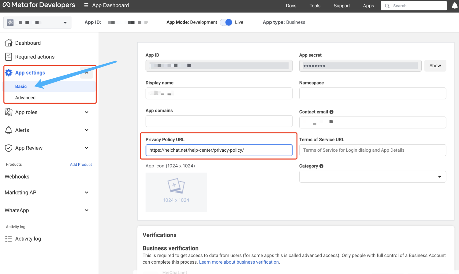 将隐私政策 URL设置为 https://heichat.net/help-center/privacy-policy