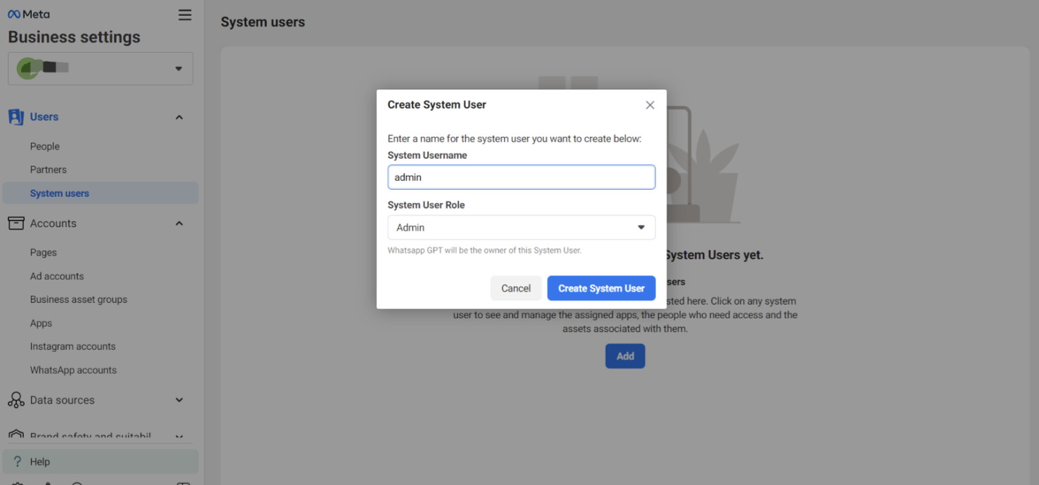 要获取永久 WhatsApp 访问令牌,请按照以下 1 至 3 个步骤操作:
