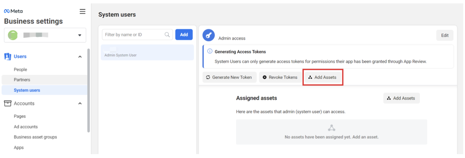 - 选择您的 Meta (Facebook) 商业账号(如果在步骤 2 中未选择)。