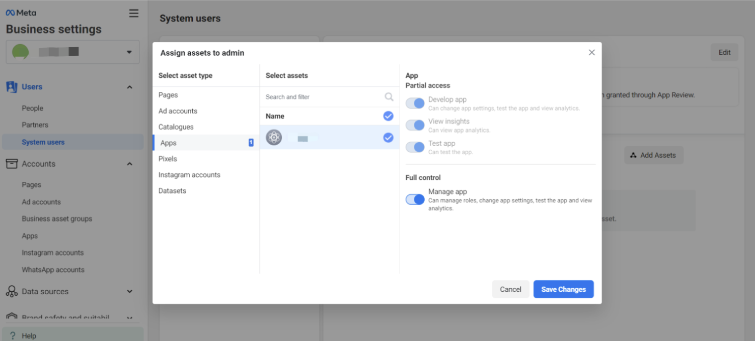 - 选择您的应用并授予完全控制权限来管理应用。