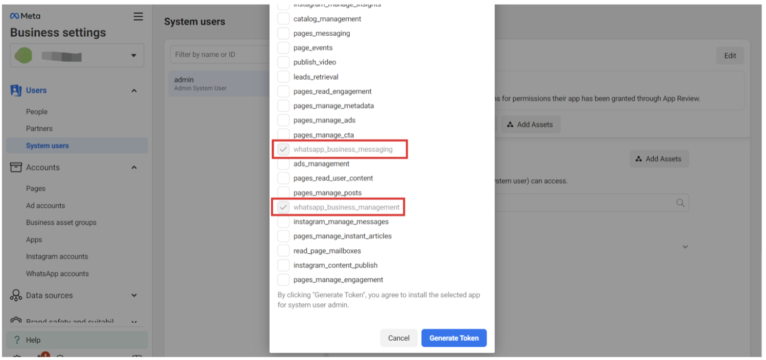 - 选择"whatsapp_business_messaging"和"whatsapp_business_management"权限。