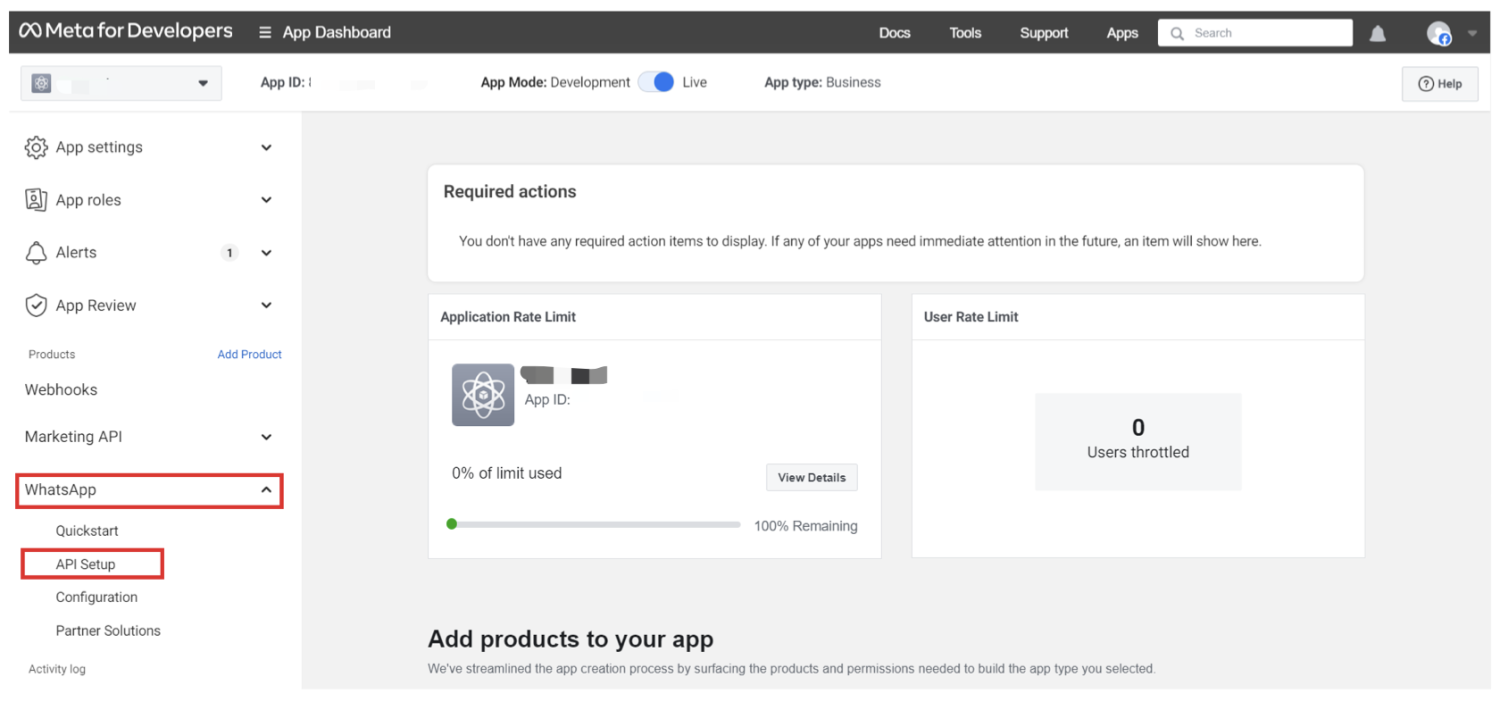 - 在 WhatsApp 开发者控制台中,从侧边栏导航到 WhatsApp > API 设置。