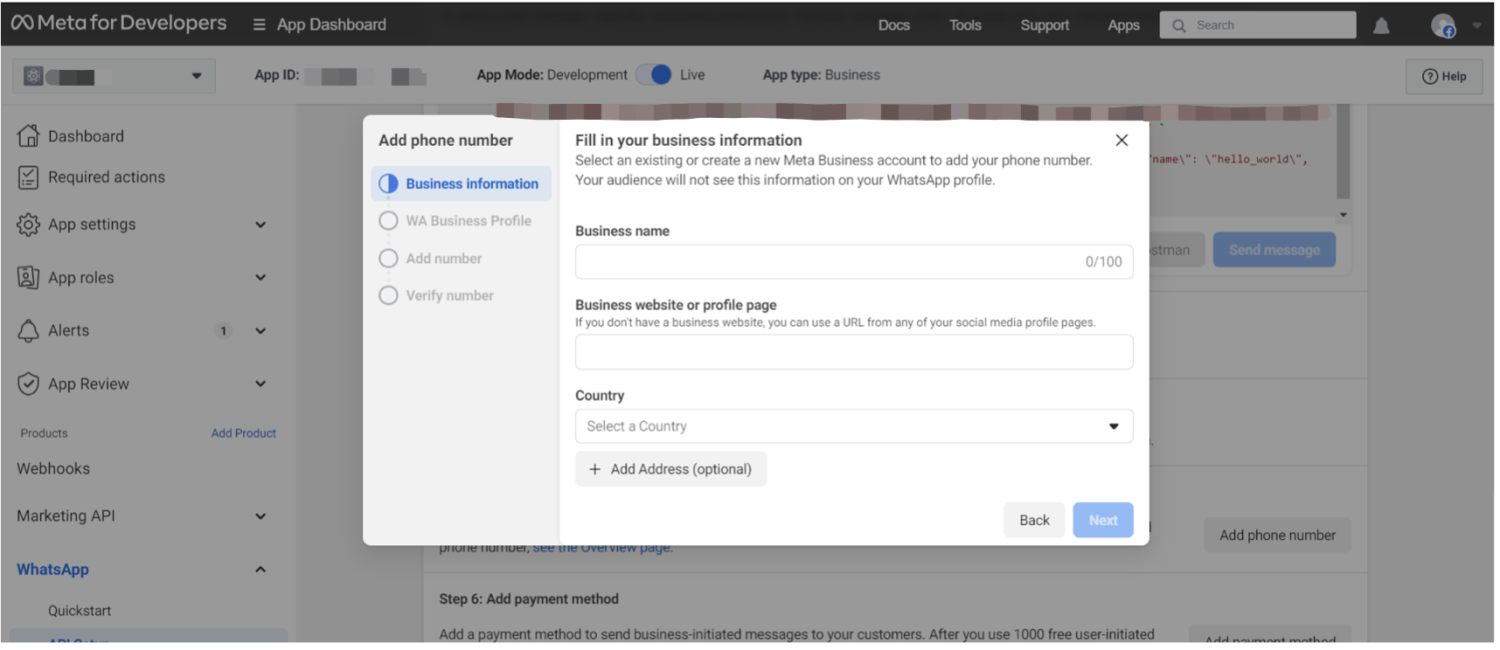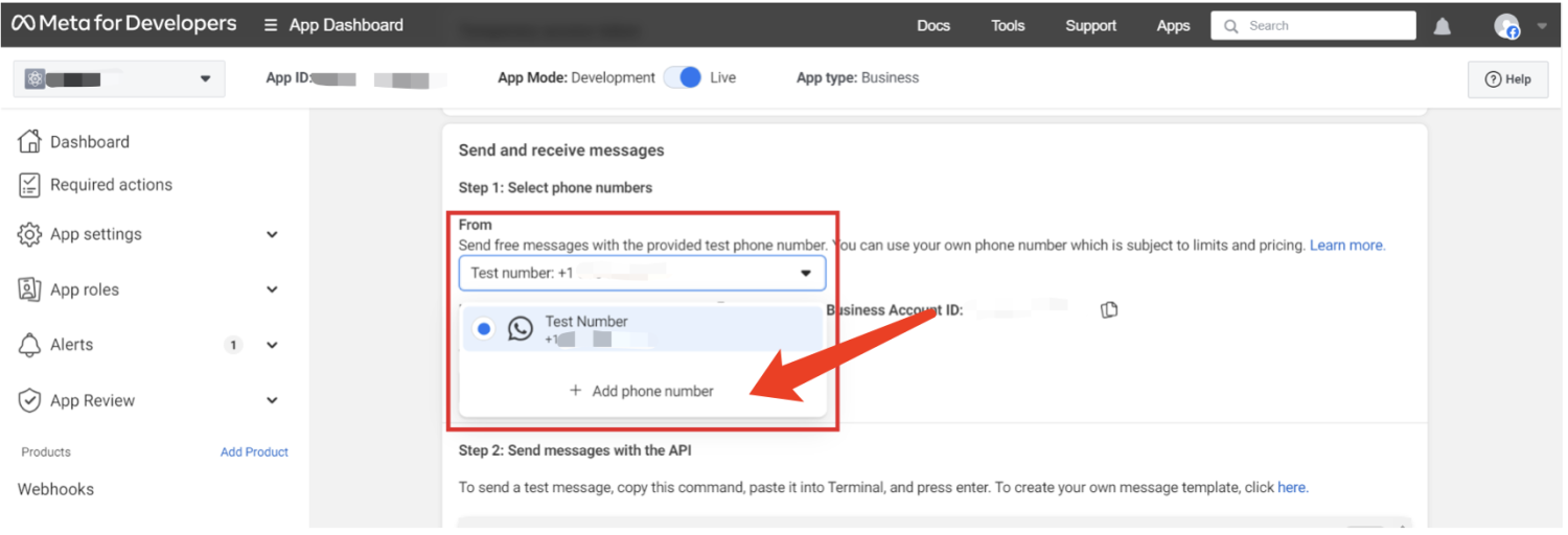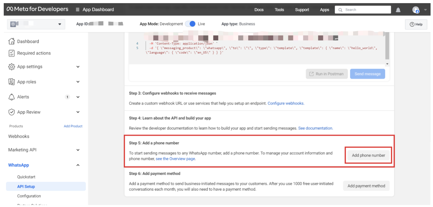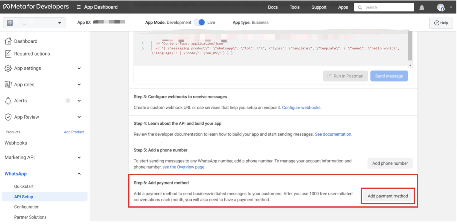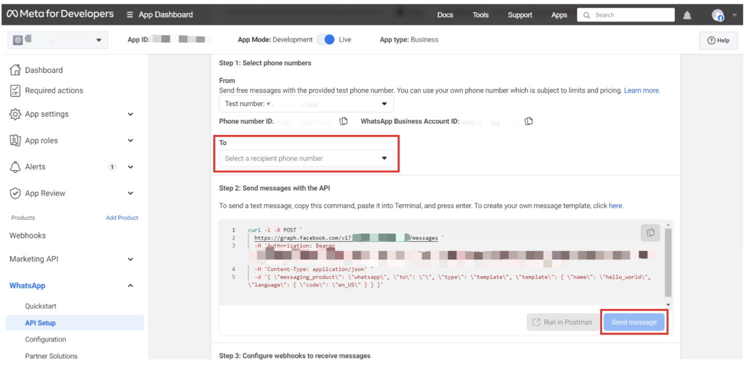 - 返回 WhatsApp 开发者控制台,导航到 API 设置 > 步骤 1。