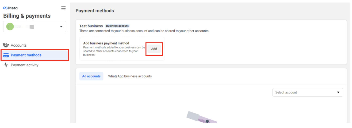 - 您将被引导至 WhatsApp 账号设置。点击"支付方式" > "添加商业支付方式",然后按照提示添加您的卡片信息。