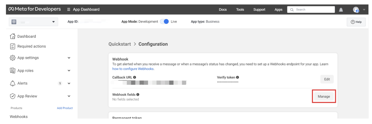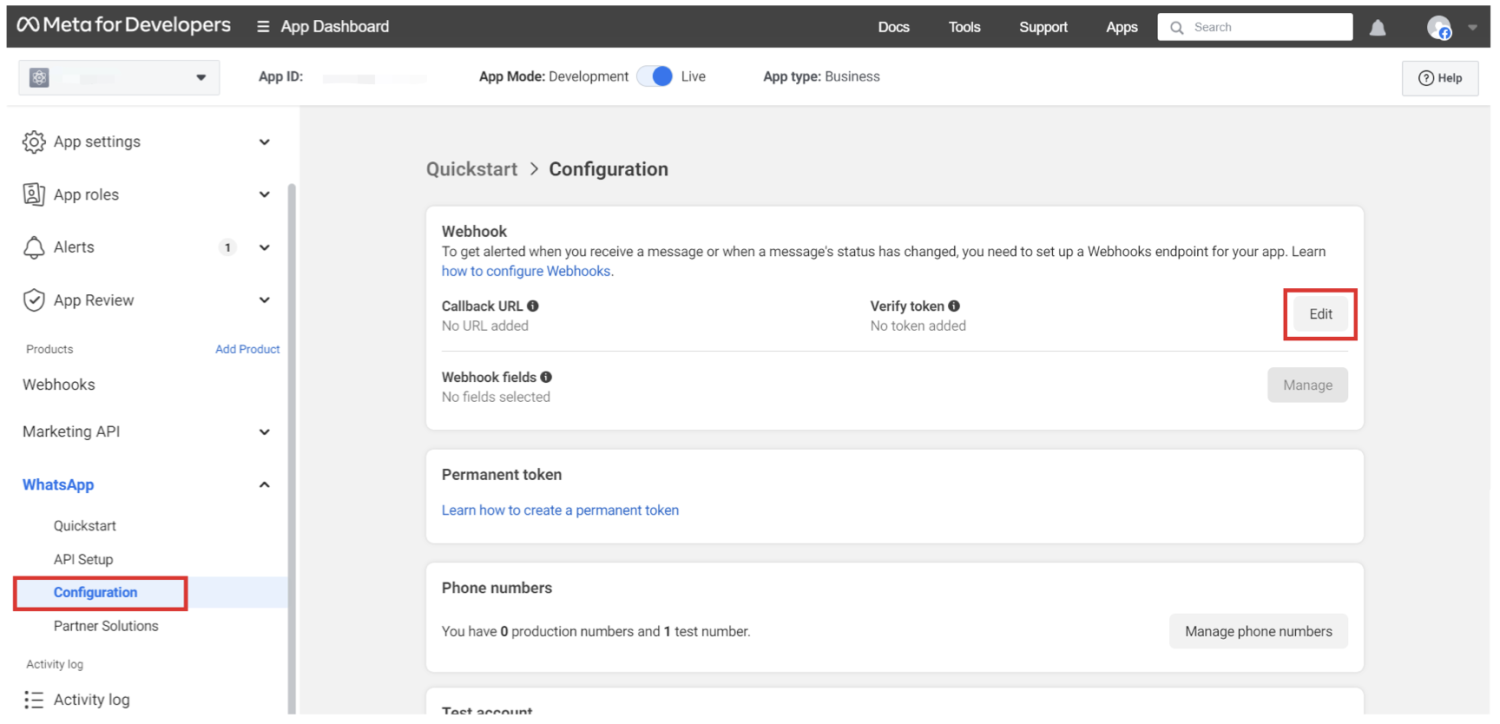 - 在 WhatsApp 开发者控制台中,导航到配置。
