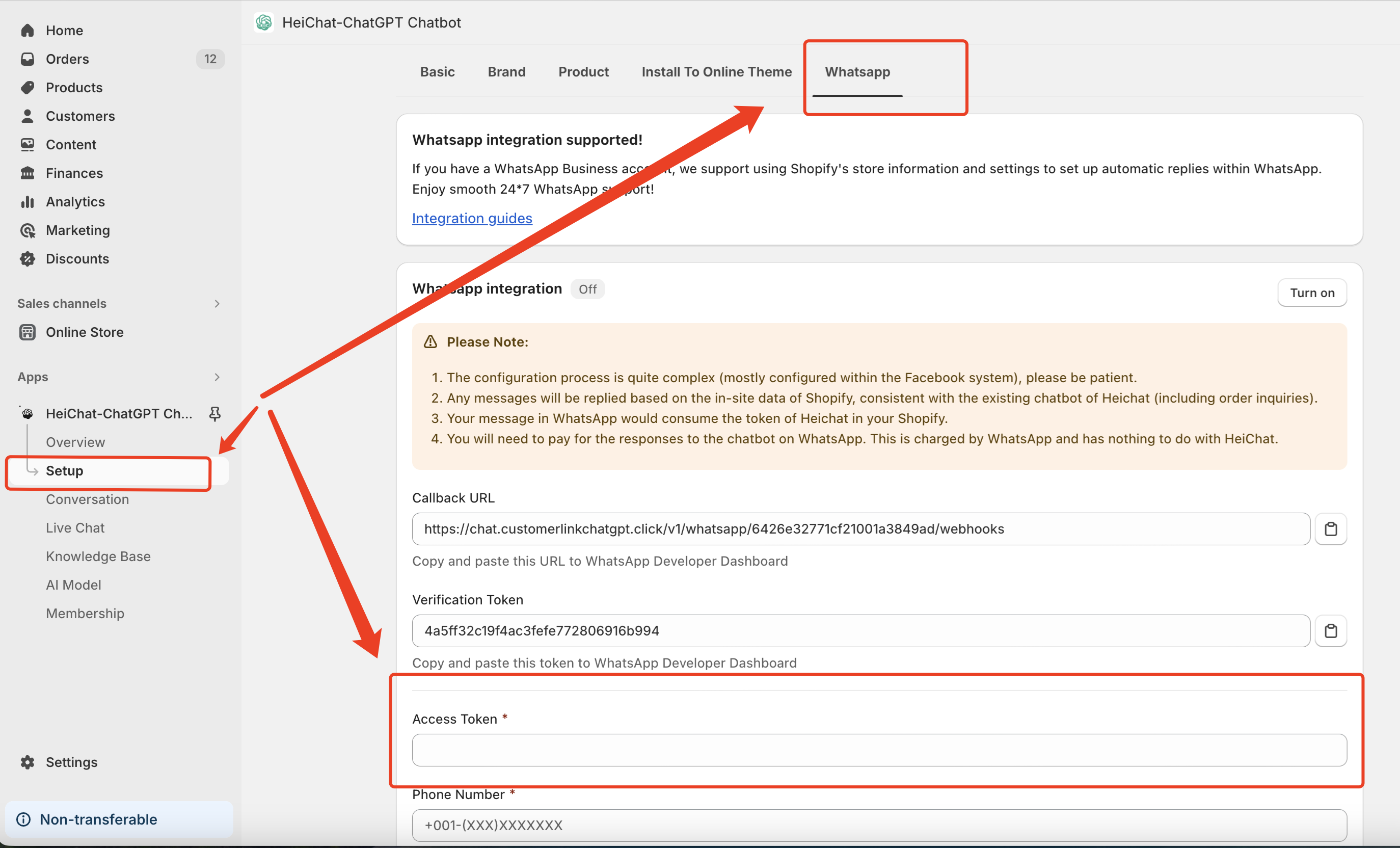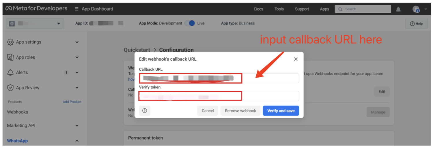 - 从 HeiChat WhatsApp 集成页面(或 HeiChat 邮件)复制回调 URL和验证令牌到您的 WhatsApp 开发者控制台。