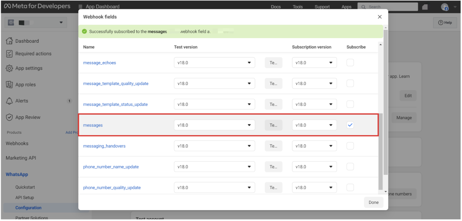 步骤 5:配置 WhatsApp API Webhook 设置