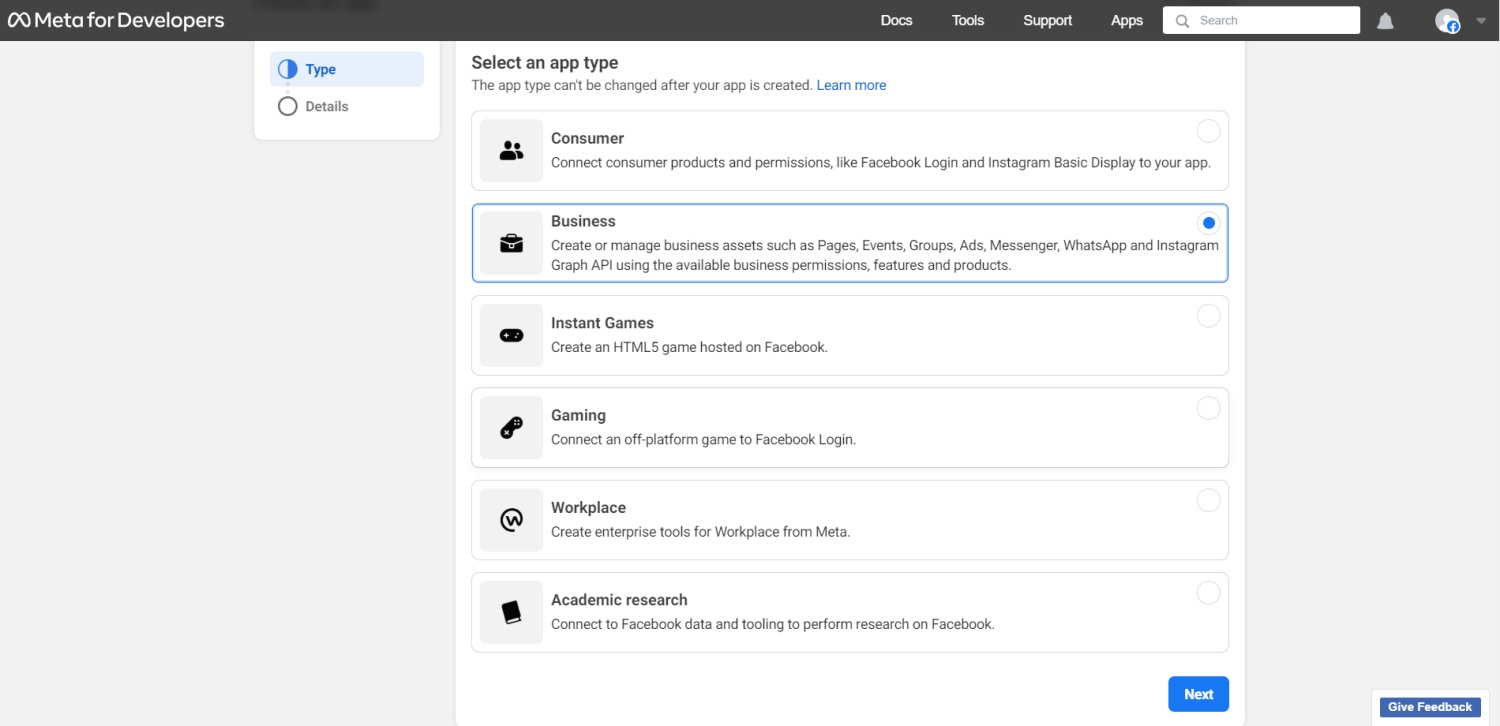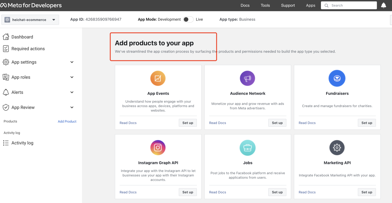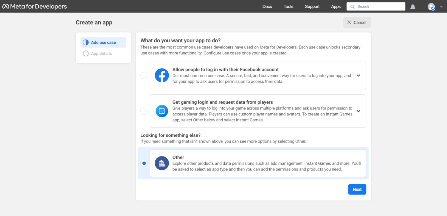 - 在 https://developers.facebook.com/ 创建新的 Meta (Facebook) 应用。